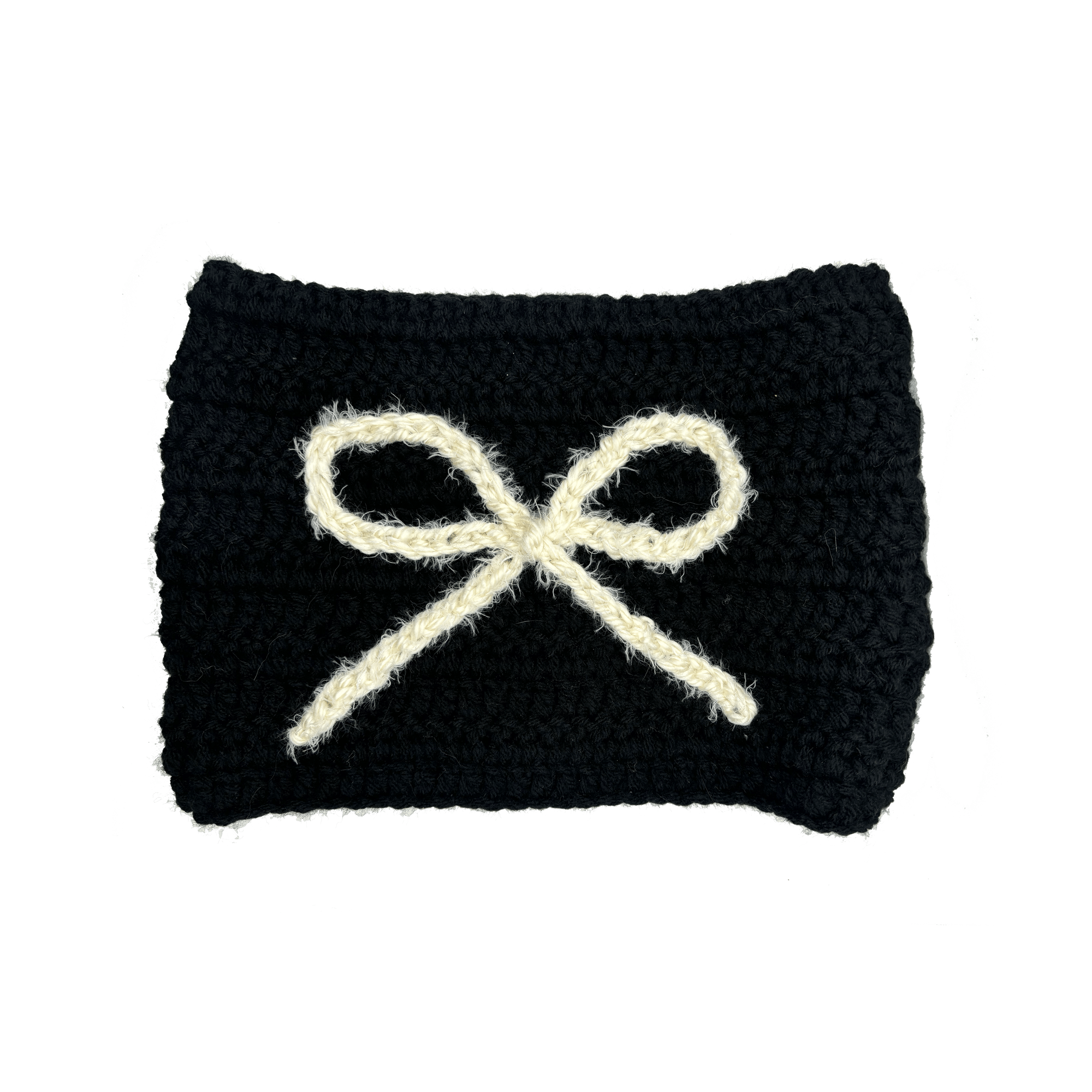 Hand crocheted square beanie with bow accent, stretchy fit.
