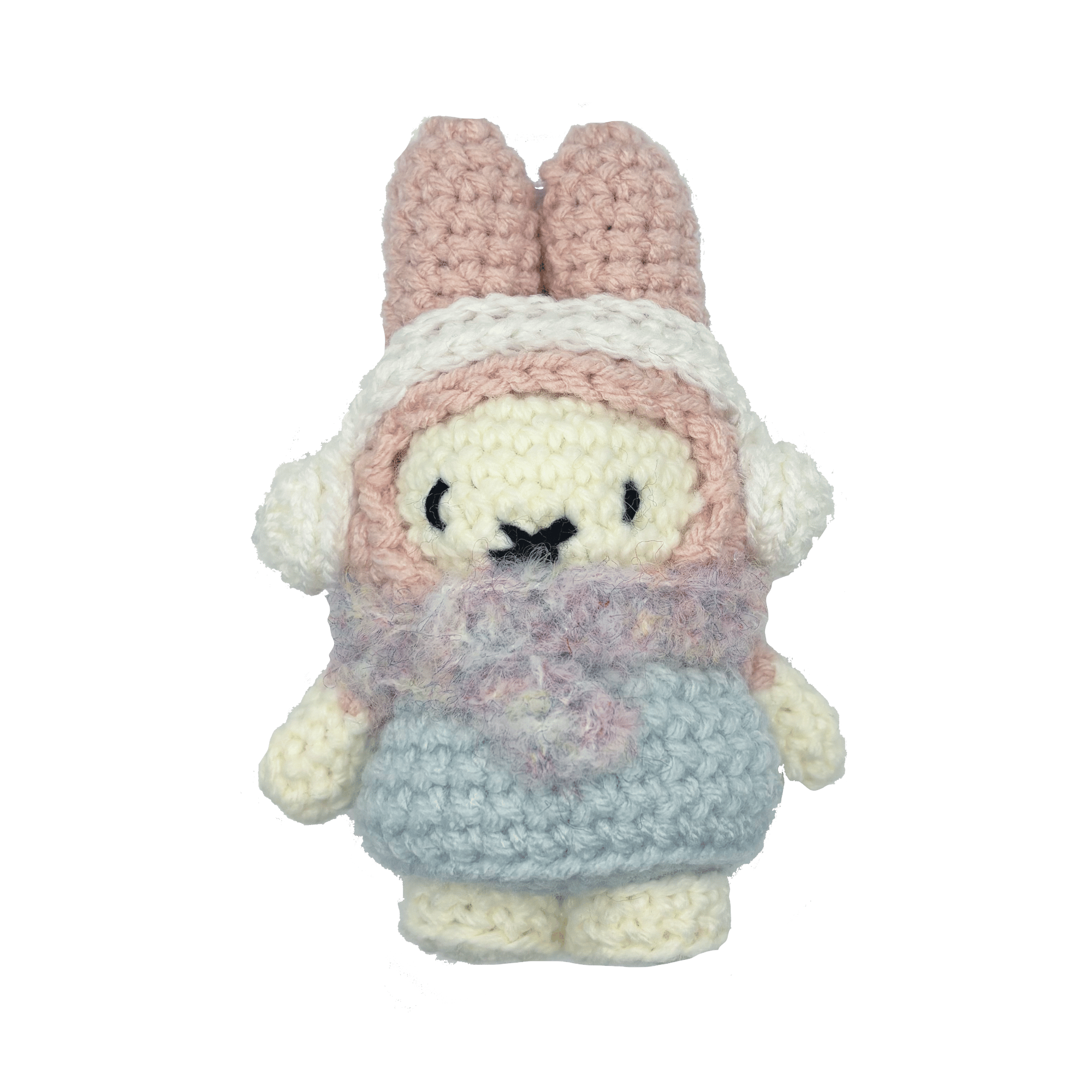 Hand crocheted bunny keychain decorated with earmuffs and a scarf Each one comes with a durable metal heart clasp keychain ring approximate size: 5.5 x 3.5 inches