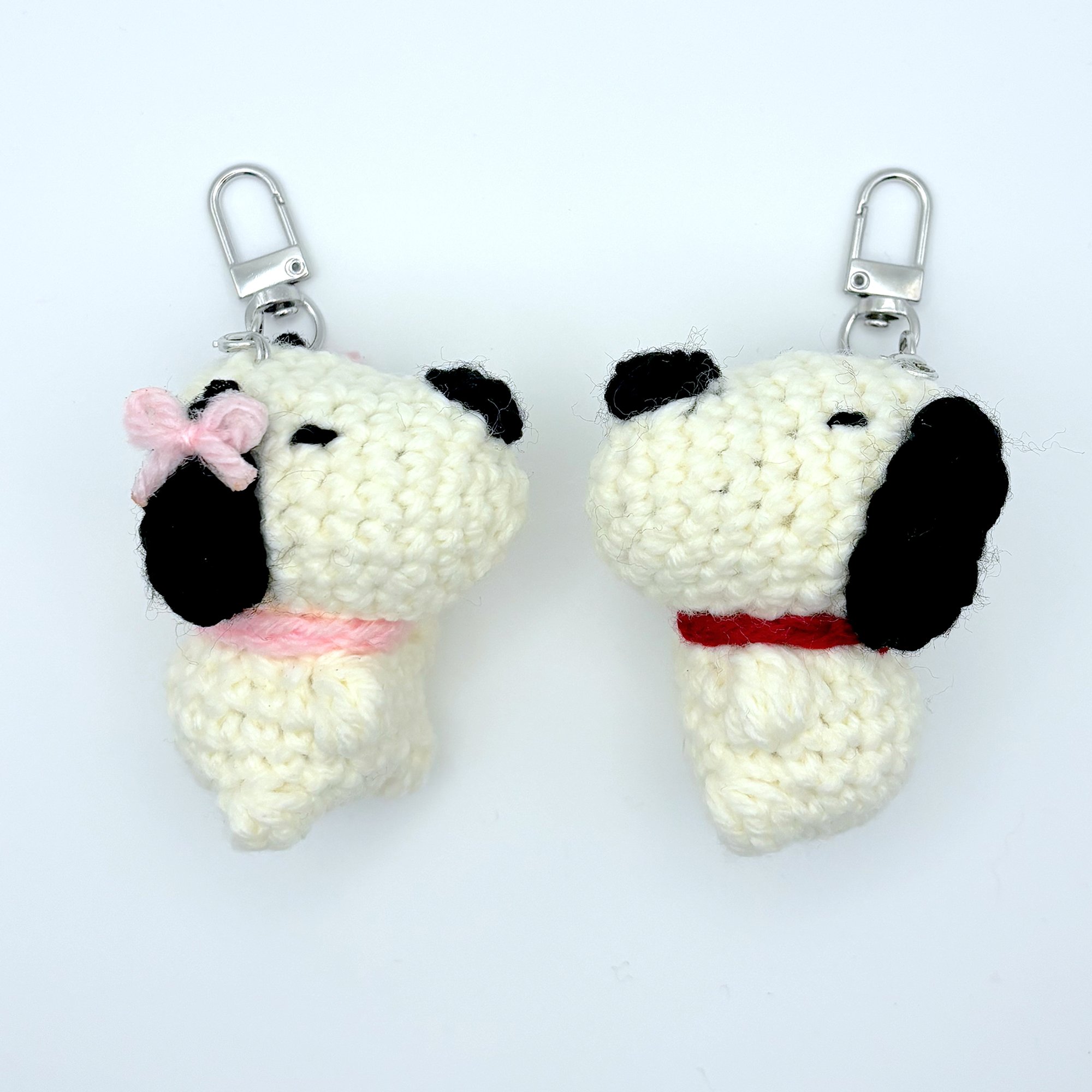 2.5x2.5 inches Each one comes with a durable metal clasp keychain ring Choice of red collar or pink collar esnupi :)